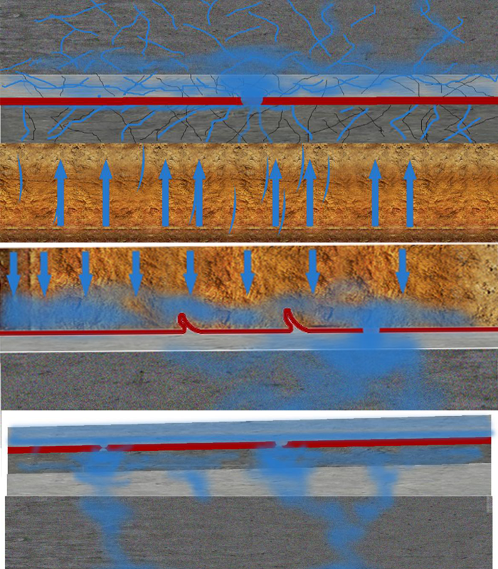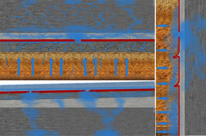 1. 底板設(shè)計(jì)缺陷:防水層與結(jié)構(gòu)底板間的保護(hù)層容易發(fā)生竄水,防水層出現(xiàn)缺陷后,滲漏水會(huì)沿著保護(hù)層間隙擴(kuò)散,導(dǎo)致底板出現(xiàn)大面積滲漏水,難以根治滲漏隱患。