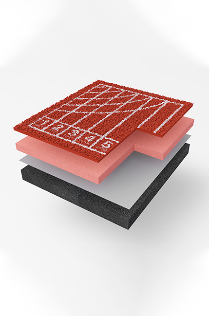發泡型高彈聚氨酯中層采用特殊的微發泡技術形成的微氣囊結構,使全塑型跑道系統的沖擊吸收和回彈性能好,有效避免運動員和中小學生運動過程中膝蓋、腳踝、足底等易受沖擊部位的運動損傷。