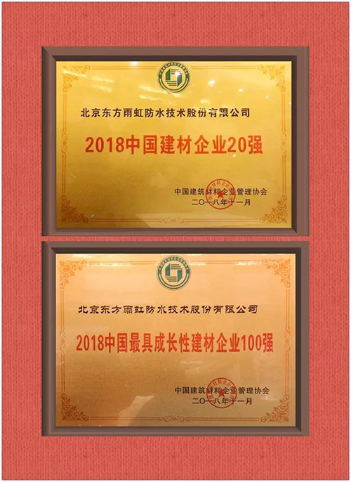 會(huì)上發(fā)布了2018中國(guó)建材企業(yè)500強(qiáng)等系列名單,東方雨虹榮獲“2018中國(guó)建材企業(yè)20強(qiáng)”“2018中國(guó)最具成長(zhǎng)性建材企業(yè)100強(qiáng)”兩項(xiàng)殊榮。