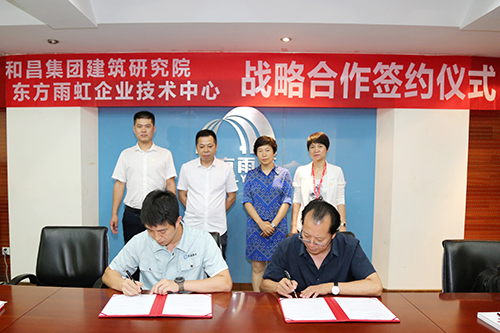 7月6日上午,和昌集團建筑研究院與東方雨虹企業技術中心舉行戰略合作簽約儀式。和昌集團工程采購部總經理於桂軍、和昌集團建筑研究院院長兼工程總監嵇雷、東方雨虹集團副總裁張志萍、集團總工程師王新、工渠(中國)副總經理王媛麗、總工程師林宏偉出席簽約儀式。
