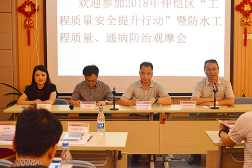 5月31日下午,由惠州市仲愷高新區(qū)住房和城鄉(xiāng)規(guī)劃建設局主辦,惠州仲愷高新區(qū)建筑行業(yè)協(xié)會協(xié)辦,廣東東方雨虹防水工程有限公司承辦的“工程質(zhì)量安全提升行動”暨防水工程質(zhì)量、通病防治觀摩會在東方雨虹惠州生產(chǎn)基地召開。仲愷區(qū)建設工程質(zhì)量安全監(jiān)督站站長劉水金、副站長吳偉浪、區(qū)住建局市場科鐘乾華,各園區(qū)、鎮(zhèn)(街道)、轄區(qū)在建項目質(zhì)量負責人以及建筑行業(yè)協(xié)會等100余人參加觀摩會。廣東東方雨虹總經(jīng)理孫福琴、總工程師周子鵠,惠州東方雨虹廠長趙海濤等出席了活動。會議由區(qū)建協(xié)副秘書長田家豪主持。