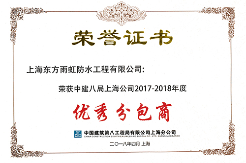4月1日,由中國(guó)建筑第八工程局有限公司上海公司舉辦的2018年“攜手共進(jìn),誠(chéng)信共贏“分供商會(huì)議在中建八局上海公司總部舉行。會(huì)上,中建八局上海公司對(duì)在2017年有作出重要貢獻(xiàn)的合作企業(yè)進(jìn)行表彰。上海東方雨虹獲評(píng)“2017-2018年度優(yōu)秀分包商”殊榮。