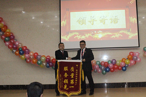 接著,楊海明先生發表講話,他對生產基地今年取得的成績表示熱烈的祝賀,并感謝咸陽生產基地2017年在產品、服務、物流方面提供的協助。張程先生也對咸陽生產基地一如既往地提供支持表示衷心感謝,并贈送致謝的錦旗。