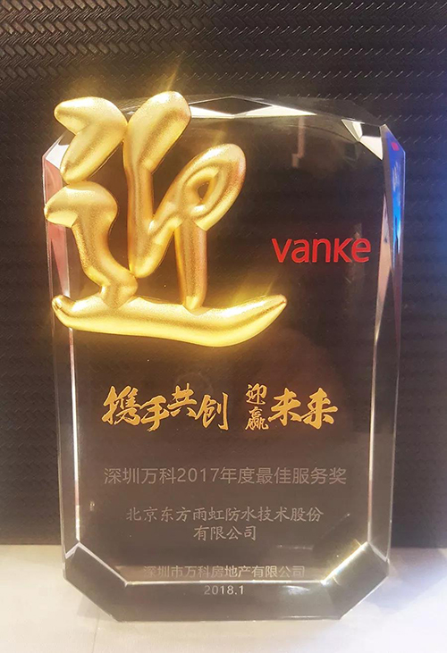 此次獲獎既是深圳萬科對東方雨虹防水系統(tǒng)服務(wù)品質(zhì)的肯定,也是雙方精誠合作的見證。東方雨虹將繼續(xù)堅持高標(biāo)準(zhǔn)、高品質(zhì)的誠信經(jīng)營和服務(wù),助力深圳萬科打造品質(zhì)工程,為和諧人居貢獻(xiàn)力量。