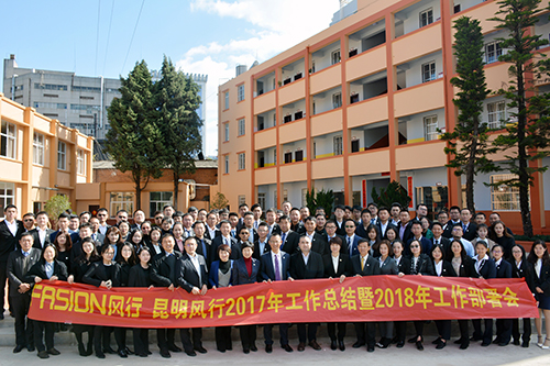 1月21日上午,風行防水在公司小禮堂組織召開2017年工作總結表彰暨2018年部署大會。會議主題為“強文化、強基礎、強管理、大提速”,特邀東方雨虹集團副總裁、工渠(中國)董事長張志萍女士,東方雨虹集團副總裁、DAW總經理熊俊先生、東方雨虹工渠(中國)副總經理兼人力資源總監王媛麗女士,東方雨虹工渠(中國)市場總監王玉飛女士,東方雨虹TPO支持服務平臺副總工程師王琮先生,德愛威華南大區副總監王建國先生,風行防水總經理呂學強先生,昆明風行生產基地廠長陳坤先生等,以及風行防水全體員工約110人參會。