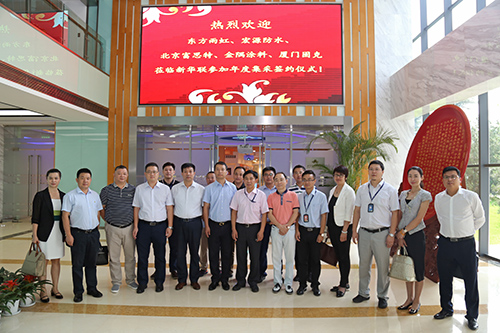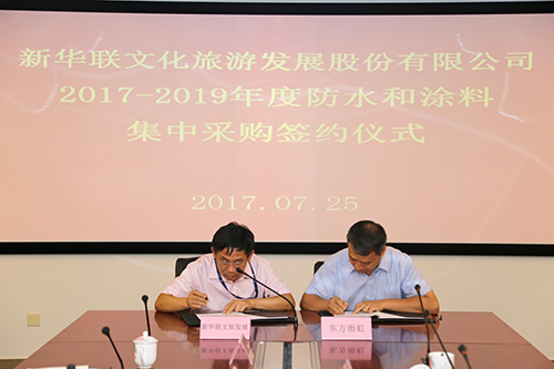 7月25日,新華聯(lián)文化旅游發(fā)展股份有限公司2017-2019年度防水和涂料集中采購簽約儀式在北京臺(tái)湖新華聯(lián)總部召開,包括東方雨虹在內(nèi)的五家涂料和防水供應(yīng)商代表受邀參加。新華聯(lián)集采中心總監(jiān)彭建奇主持儀式,東方雨虹集團(tuán)副總裁張洪濤參加簽約儀式并發(fā)言。
