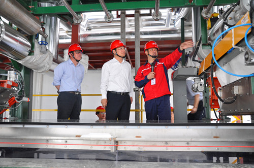王成長聽取徐庭忠對生產(chǎn)設備的介紹