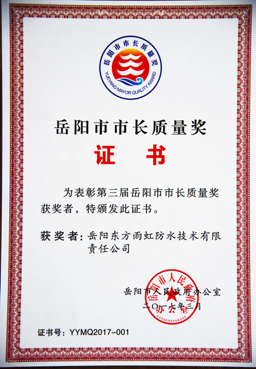 岳陽(yáng)市為提升全市質(zhì)量水平,從2000年開(kāi)始每年召開(kāi)全市質(zhì)量工作會(huì)議,2010年開(kāi)始實(shí)施質(zhì)量興市戰(zhàn)略,2012年開(kāi)始設(shè)置市長(zhǎng)質(zhì)量獎(jiǎng),2016年開(kāi)始開(kāi)展質(zhì)量工作考核,對(duì)質(zhì)量管理工作高度重視。會(huì)上,楊昆在發(fā)言中多次提到東方雨虹的質(zhì)量管理工作,對(duì)岳陽(yáng)東方雨虹的發(fā)展給予高度評(píng)價(jià),并號(hào)召在場(chǎng)其它企業(yè)家向東方雨虹學(xué)習(xí),狠抓質(zhì)量,通過(guò)質(zhì)量創(chuàng)品牌。 本次獲獎(jiǎng),是岳陽(yáng)市政府和社會(huì)各界對(duì)東方雨虹的質(zhì)量品質(zhì)及綜合競(jìng)爭(zhēng)力的高度認(rèn)可,既是榮譽(yù),也是責(zé)任,東方雨虹將繼續(xù)在追求卓越的道路上努力前行,繼續(xù)強(qiáng)化質(zhì)量意識(shí),加強(qiáng)質(zhì)量管理,落實(shí)質(zhì)量責(zé)任,提高產(chǎn)品、工程和服務(wù)的質(zhì)量,以質(zhì)量和品質(zhì)回報(bào)社會(huì)對(duì)東方雨虹的信任和認(rèn)可。