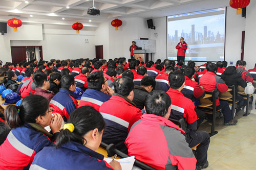 早上七點(diǎn),唐山生產(chǎn)基地廠長馬到原在辦公樓前迎接所有員工,給大家拜年并發(fā)放開年紅包。八點(diǎn),全體員工集合,進(jìn)行農(nóng)歷新年第一次升旗儀式,由馬到原和各部門主管級(jí)以上人員簽訂2017年度安全責(zé)任狀,組織全體員工進(jìn)行安全宣誓,隨后,全體人員進(jìn)行了2個(gè)小時(shí)的安全培訓(xùn)。