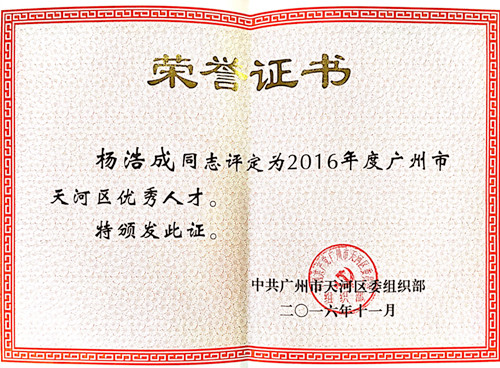 廣東東方雨虹董事長楊浩成獲評“2016年度廣州市天河區優秀人才”