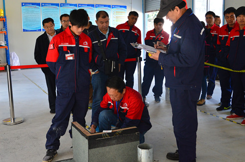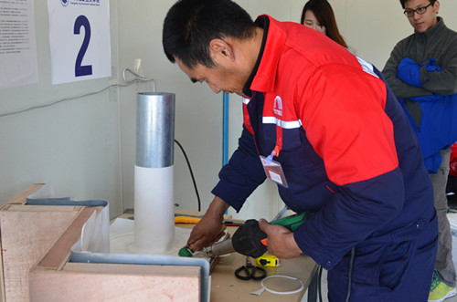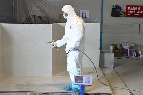 在緊張激烈的切磋技藝過程中,裁判員始終秉承公平公正原則,分別從施工時間、工藝標準、陰陽角處理、管根做法、JSA攪拌、立面噴涂等主要節點來考核評比參賽選手對防水施工技術掌握情況。參賽選手們各顯其能,充分展現了過硬的技術本領和良好的精神風貌,精湛的施工技術除了贏得在場參觀人員的一致好評,還吸引了城建學院的領導和師生前來觀摩學習。