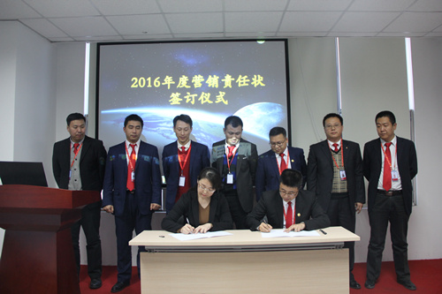 在對華砂2015年度優(yōu)秀員工及優(yōu)秀經(jīng)理人頒獎(jiǎng)表彰后,華砂商務(wù)總監(jiān)王曉峰先生上臺(tái)同張穎女士簽訂2016年?duì)I銷責(zé)任狀。