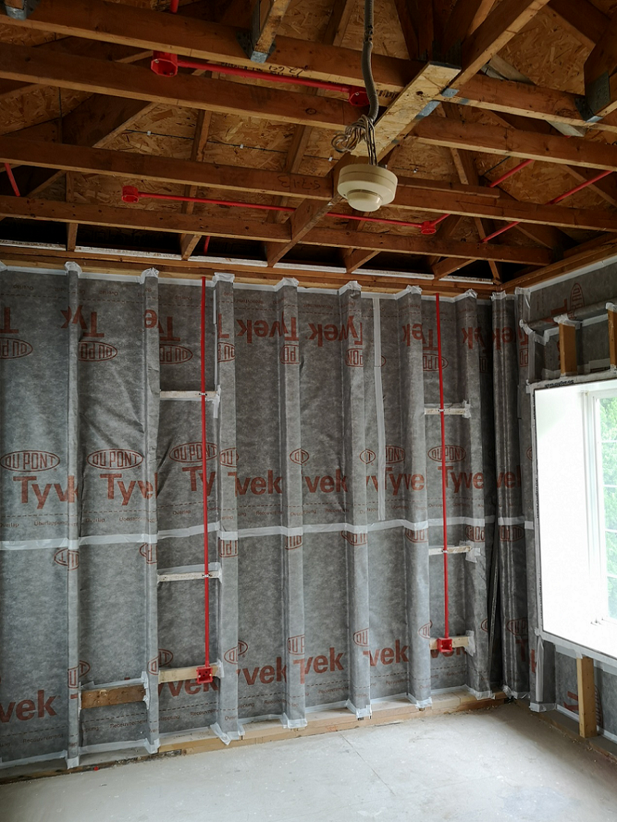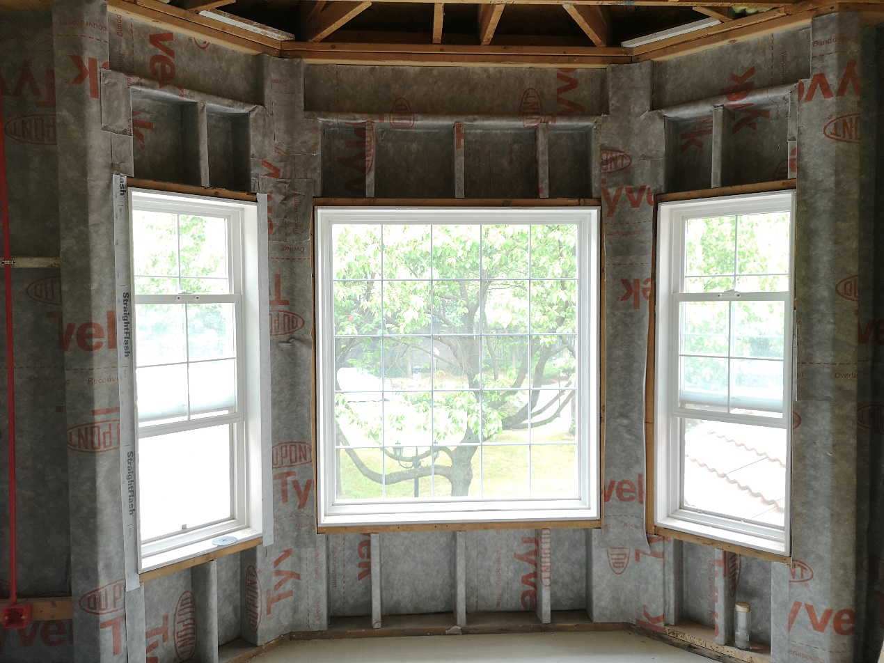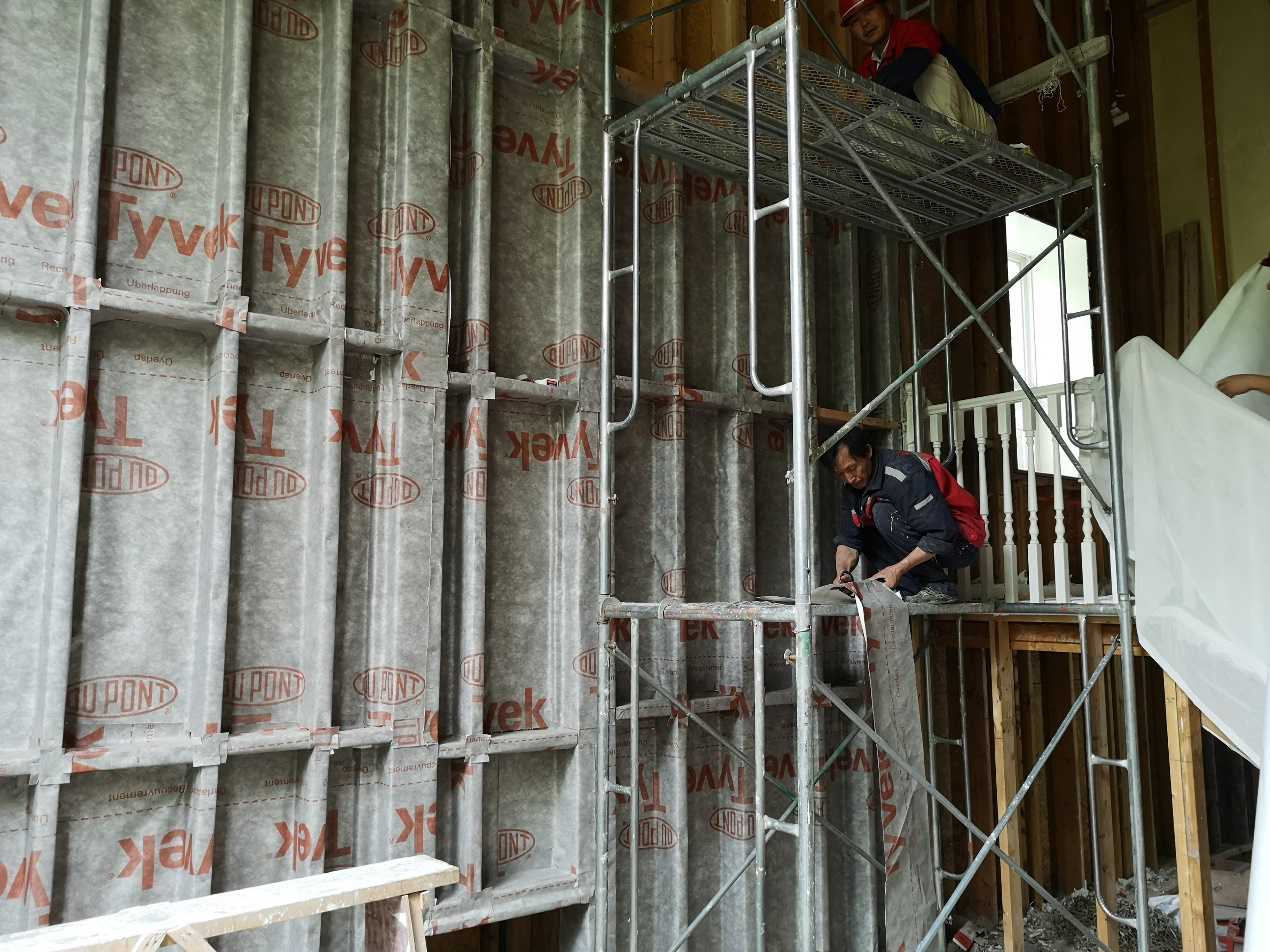 特衛(wèi)強(qiáng)®防水透汽膜可防止外部雨、雪、昆蟲等對建筑的侵蝕,杜絕了濕氣的來源,另外其獨(dú)特的透水蒸氣性能,又能讓建筑墻體中的濕氣排出,避免潮氣在建筑墻體中的滯留。防水透汽膜一般用于建筑墻體靠外一側(cè),本項目翻新時先做防水透汽膜的施工,施工工藝為空鋪,由墻角從下往上施工,采用木工釘或氣釘間隔300~600mm加以固定,并配合配套膠帶對拼接縫進(jìn)行密封,干作業(yè)施工便捷,縮短維修工期。在建筑翻新過程中無需拆除建筑外墻裝飾,室內(nèi)作業(yè)不受環(huán)境影響,施工干擾性小。