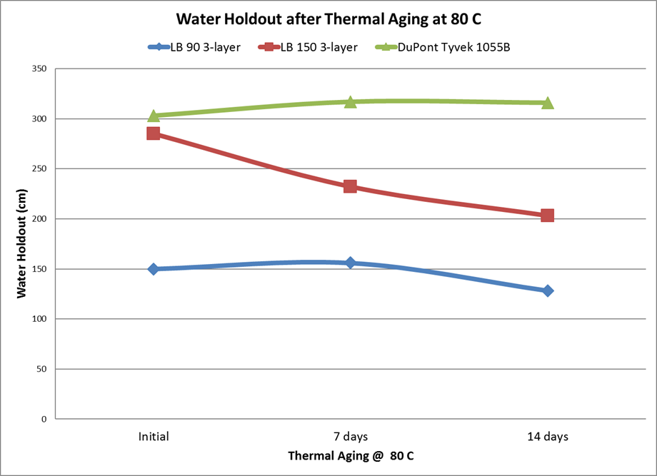 (80℃熱老化后的耐水柱高度,綠色為特衛強1055B,紅色和藍色為三層復合構造產品)