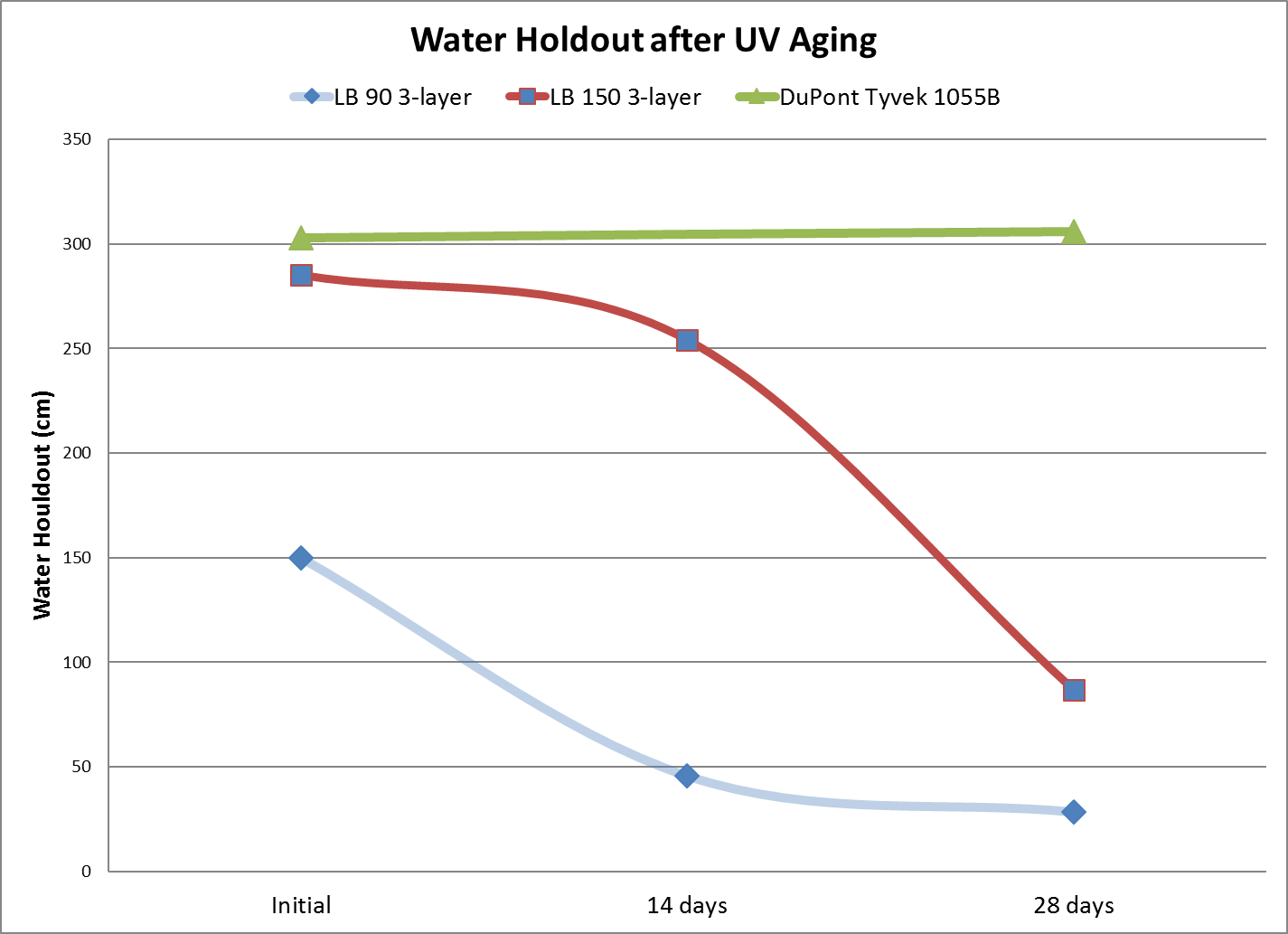 (UV老化后的耐水柱高度,綠色為特衛強1055B,紅色和藍色為三層復合構造產品)